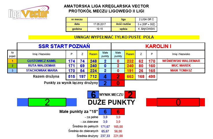 W Amatorskiej Lidze Kręglarskiej Vector drużyna SSR Start Poznań pokonała zespół Karolin I 2:0, 6:2, 712:663.