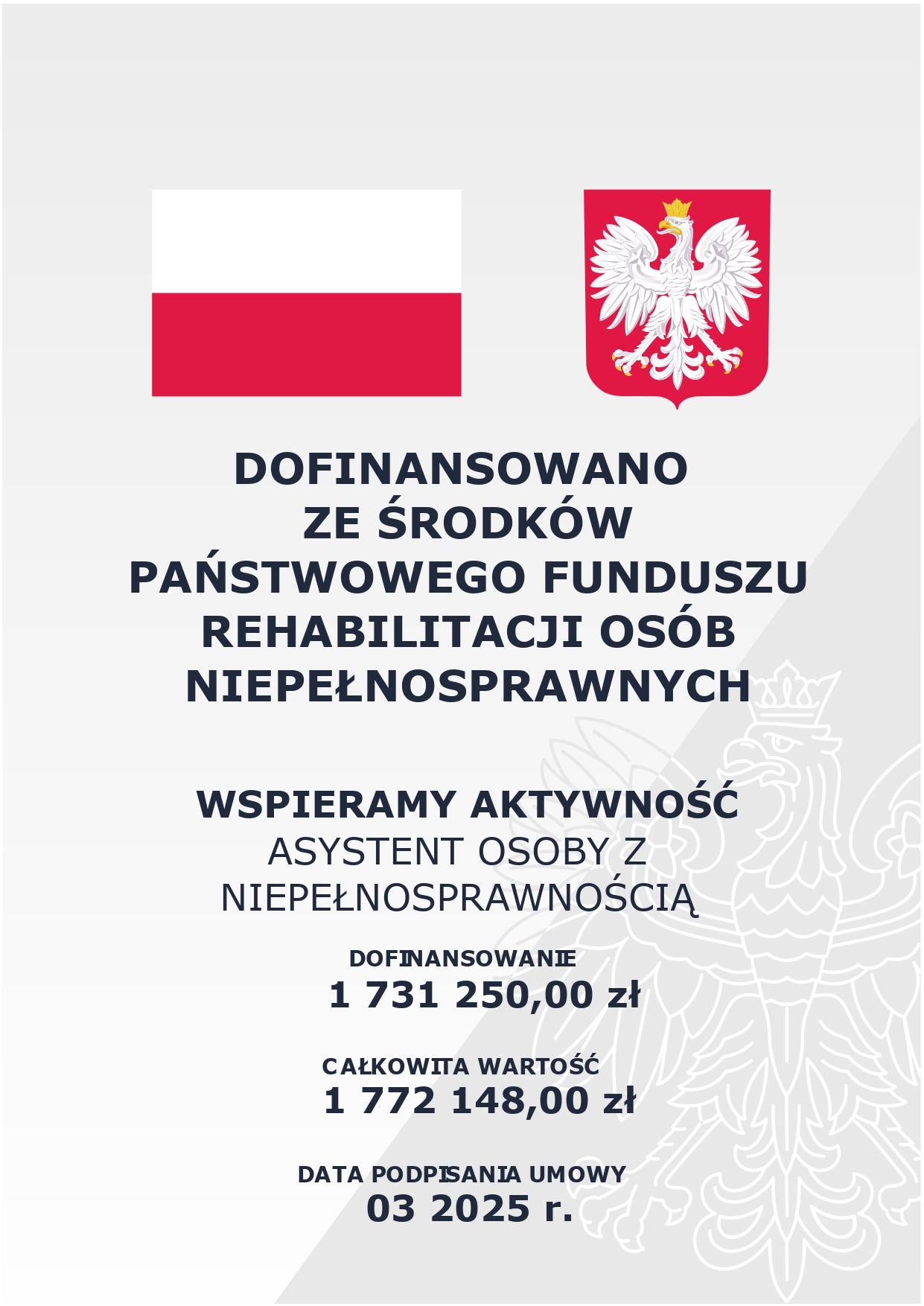 Projekt, którego celem jest zorganizowanie usług asystencji osobistej dla osób z niepełnosprawnościami, wsparcie Osób z Niepełnosprawnościami poprzez zwiększenie możliwości zaspokojenia ich potrzeb, poprawę funkcjonowania w ich środowisku oraz włączenie w życie społeczne współfinansowany jest ze środków Państwowego Funduszu Rehabilitacji Osób Niepełnosprawnych.