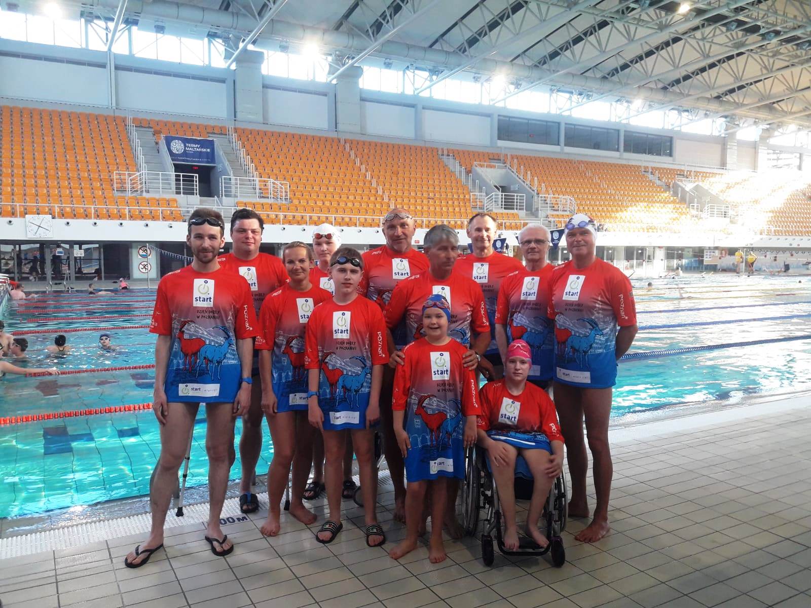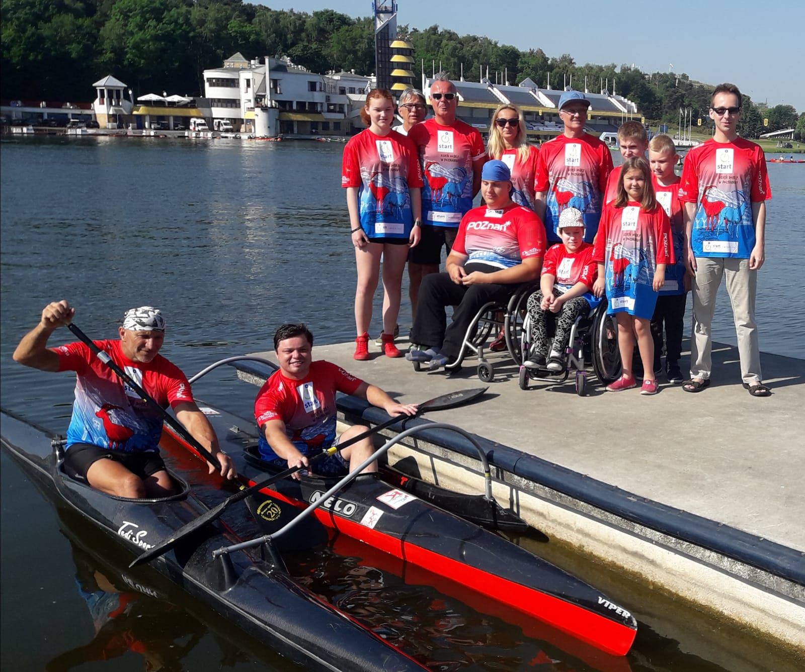 Zawodnicy i szkoleniowcy sekcji kajakowej i pływackiej w nowych koszulkach STARTu Poznań – prezentują się fajnie, prawda?